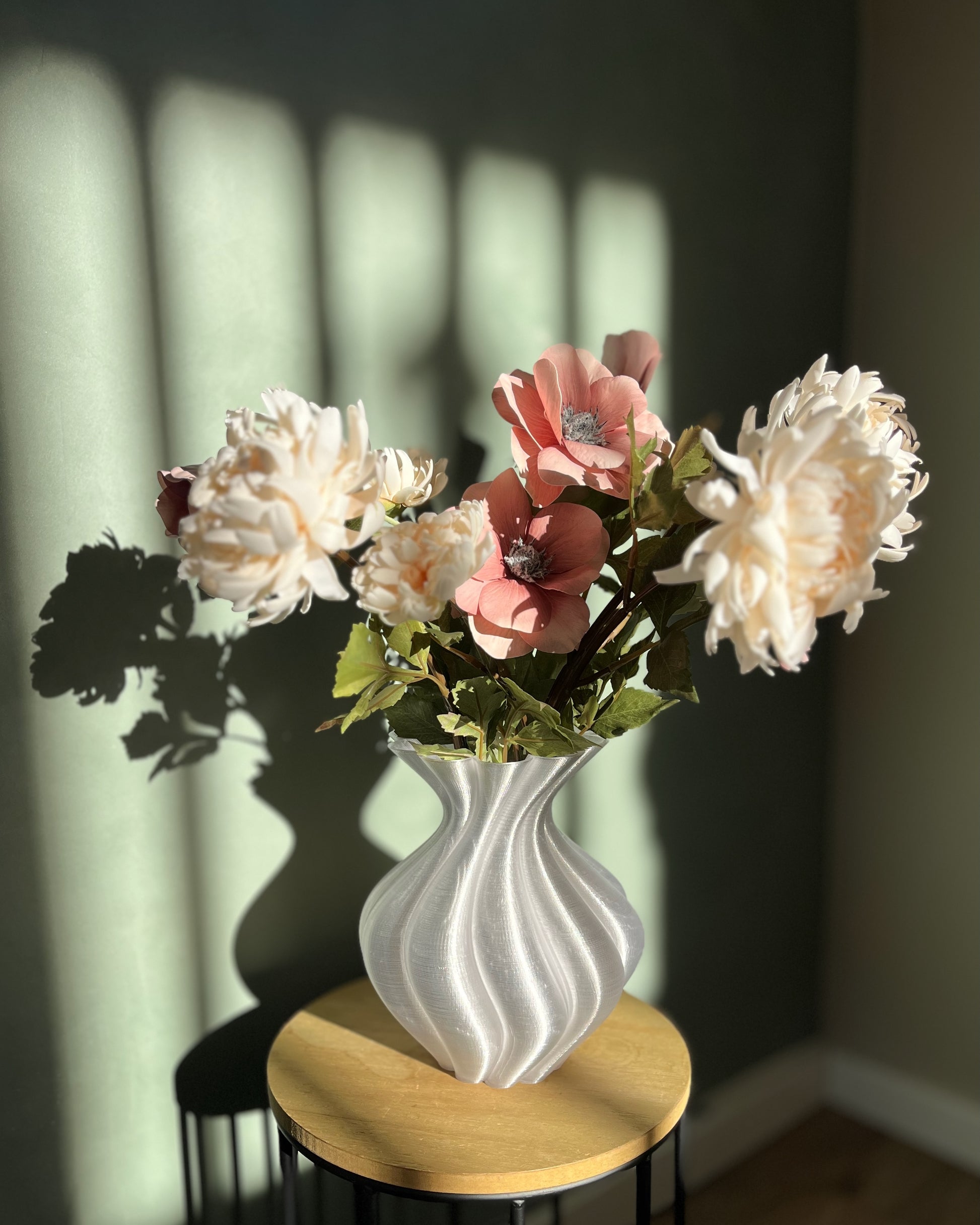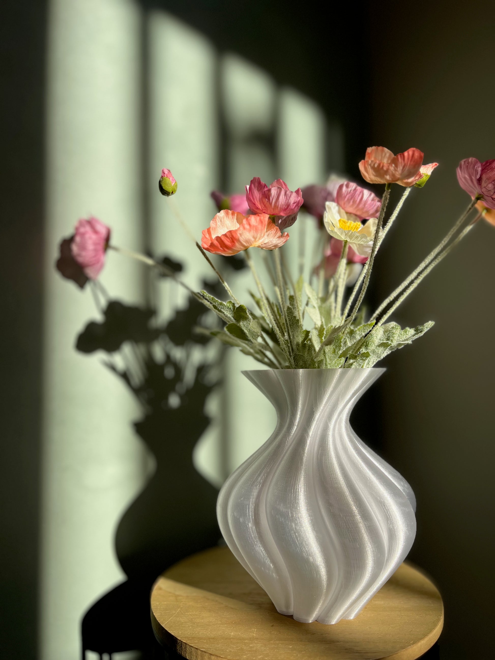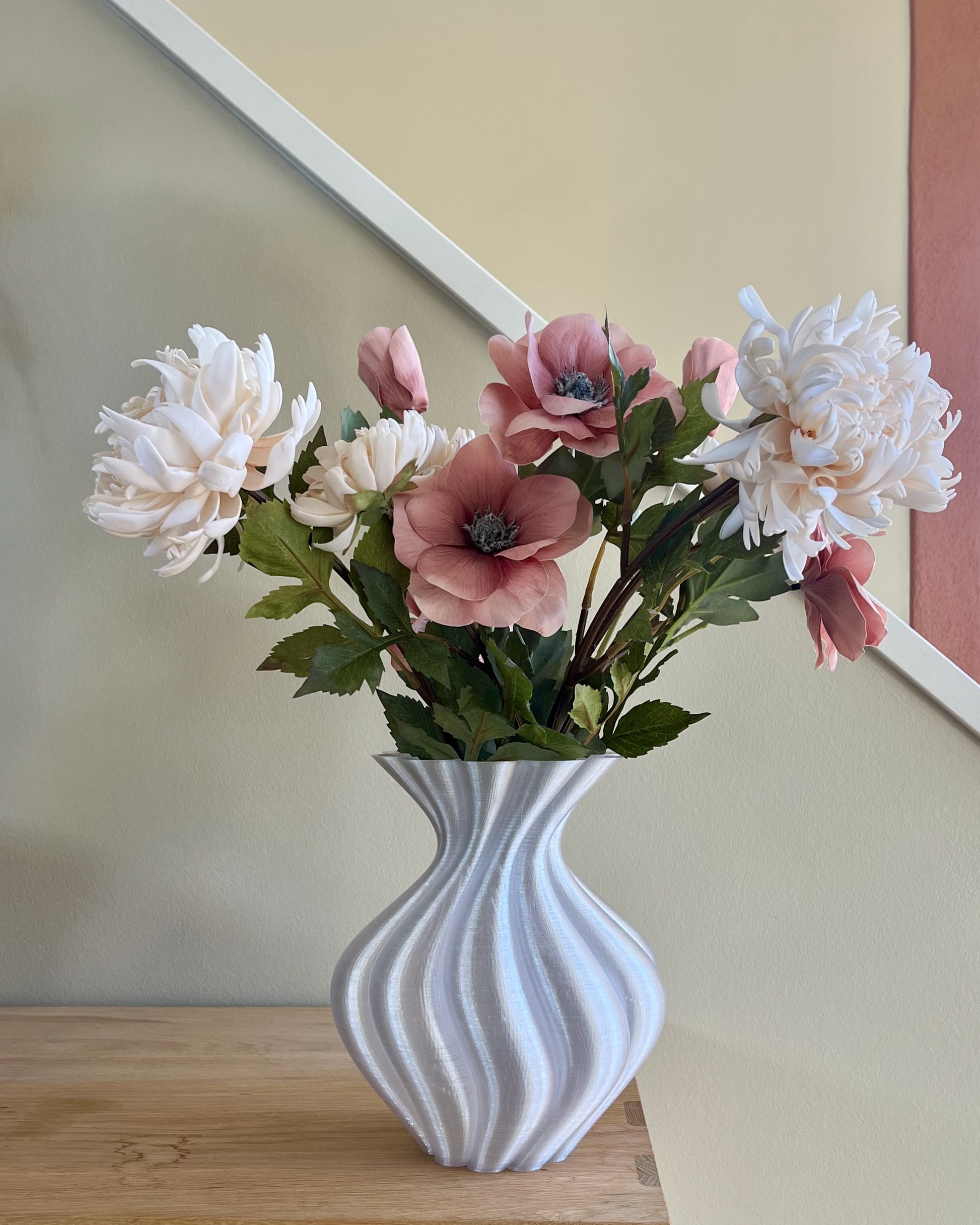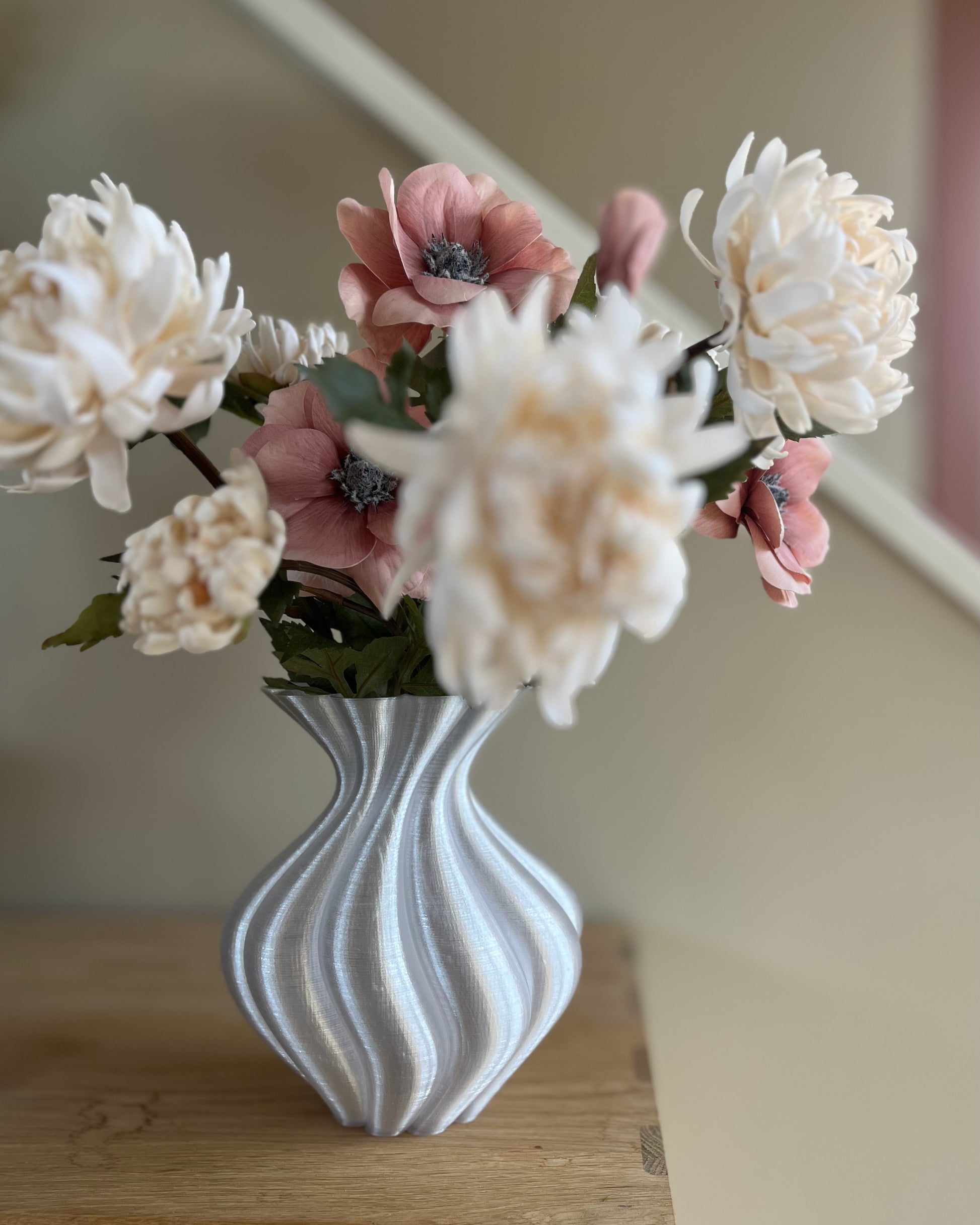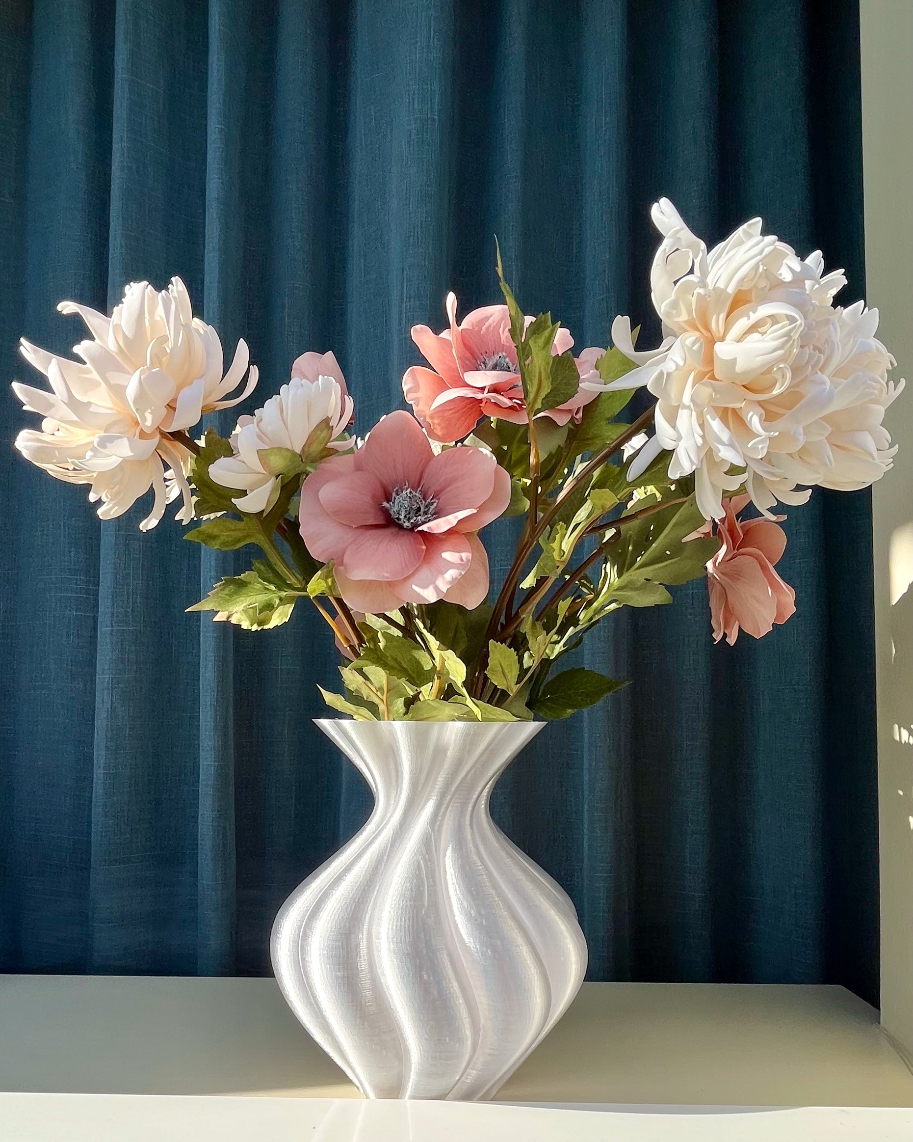 Vasen er 3D-printet i PETG-plast, hvilket gør den både robust og stabil, så den står sikkert, uanset hvor du placerer den. Med en højde på 22 cm er Estella perfekt til både friske og kunstige blomster eller tørrede buketter. Materialet giver en let skinnende overflade, der elegant reflekterer lyset og fremhæver vasens unikke struktur.