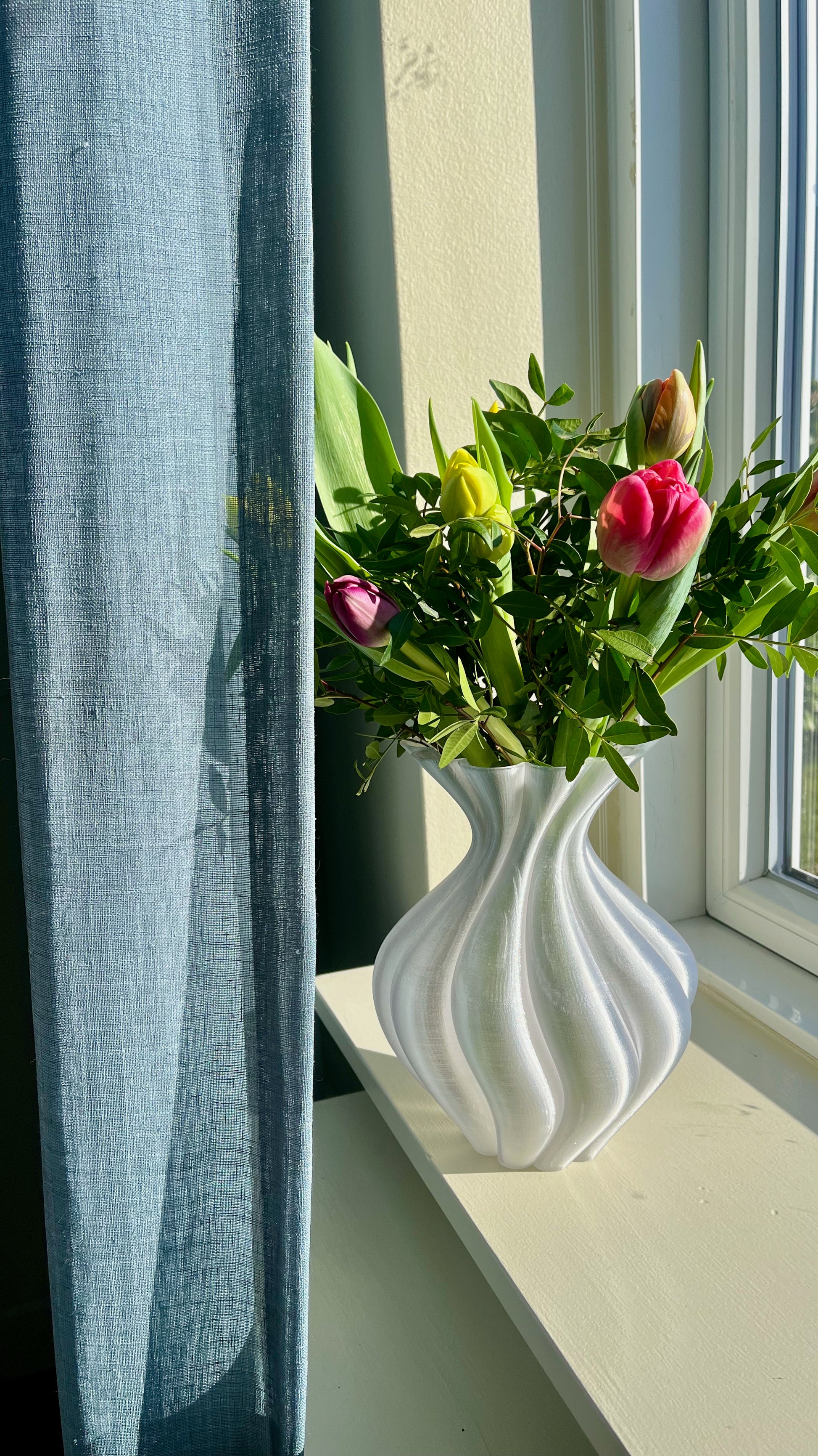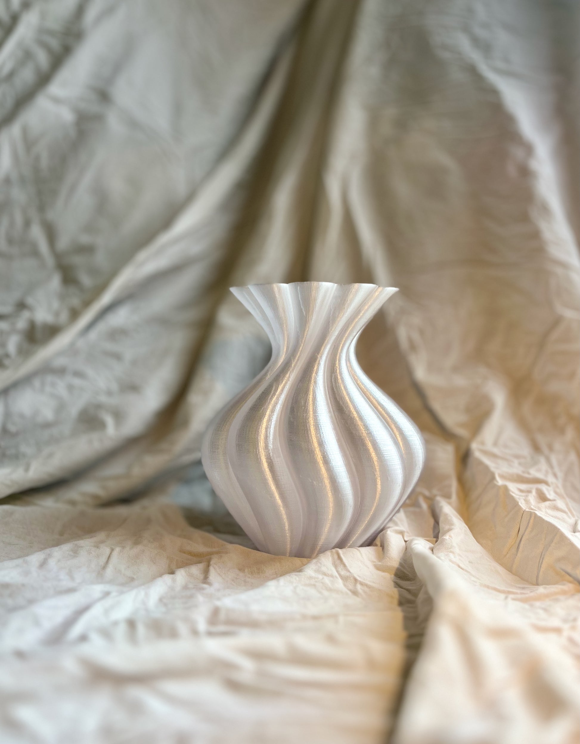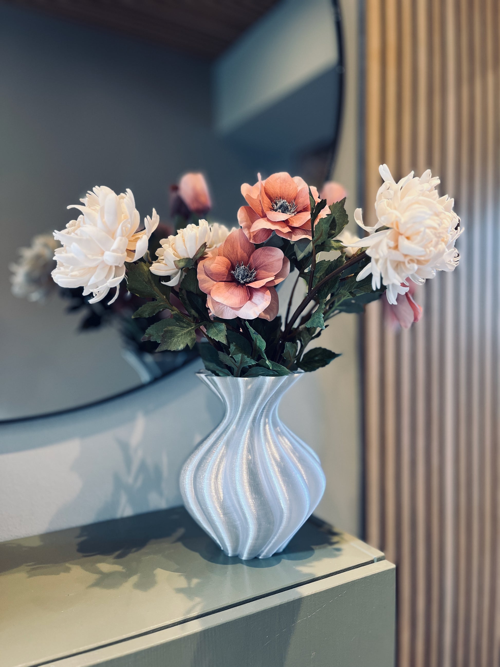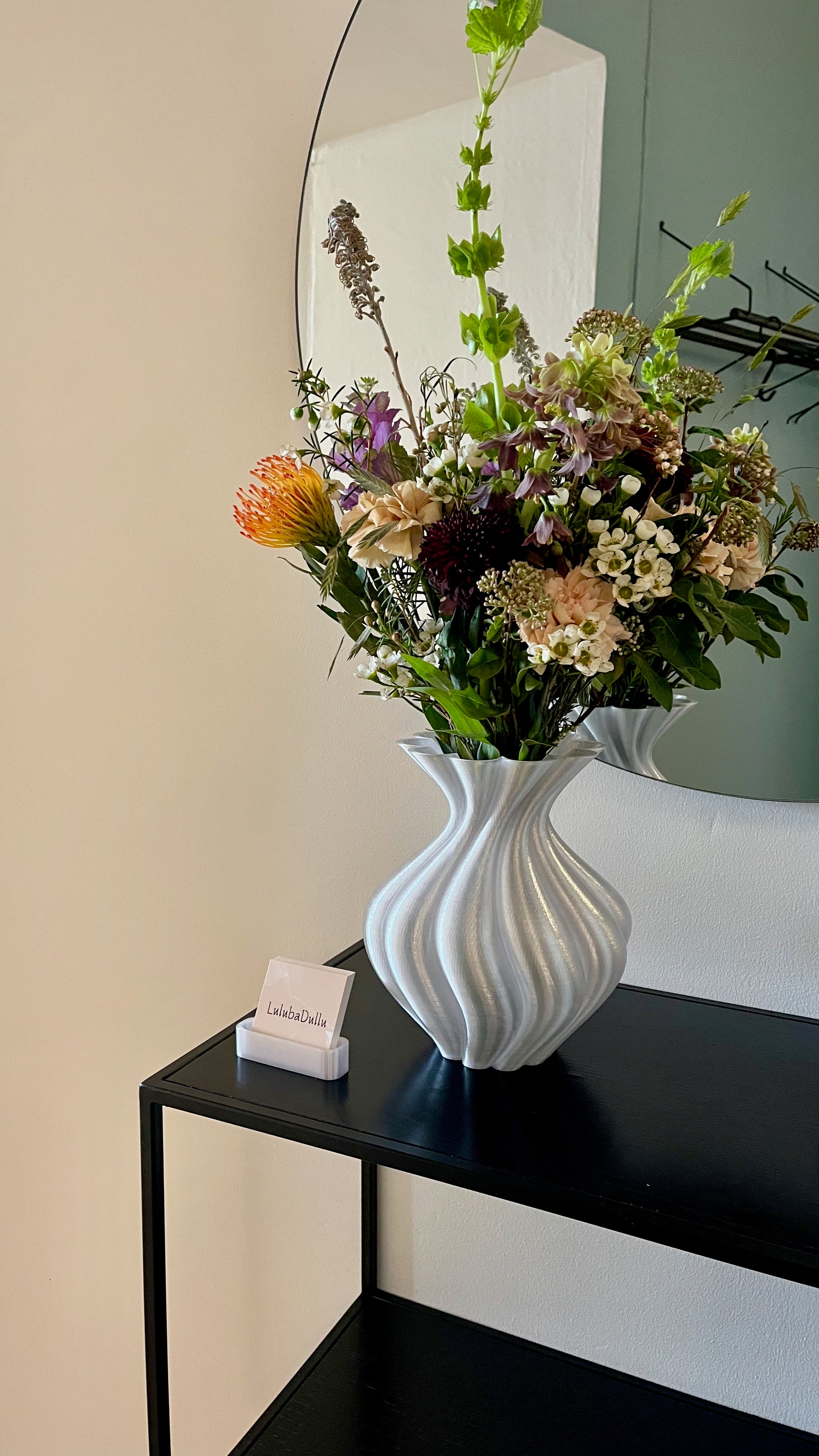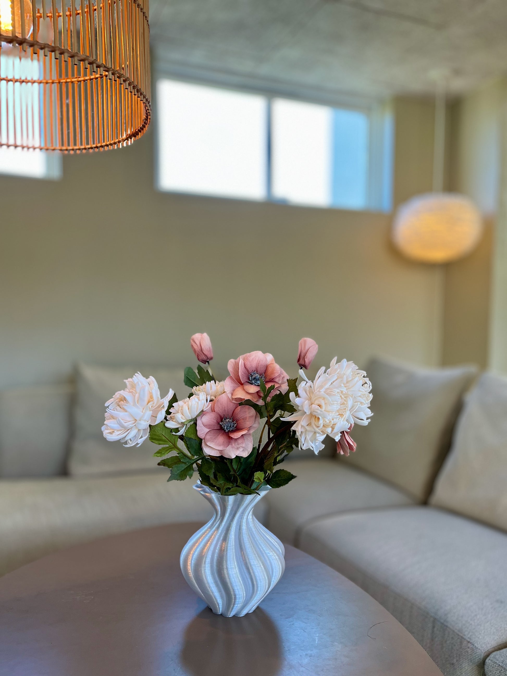 Vasen er 3D-printet i PETG-plast, hvilket gør den både robust og stabil, så den står sikkert, uanset hvor du placerer den. Med en højde på 22 cm er Estella perfekt til både friske og kunstige blomster eller tørrede buketter. Materialet giver en let skinnende overflade, der elegant reflekterer lyset og fremhæver vasens unikke struktur.