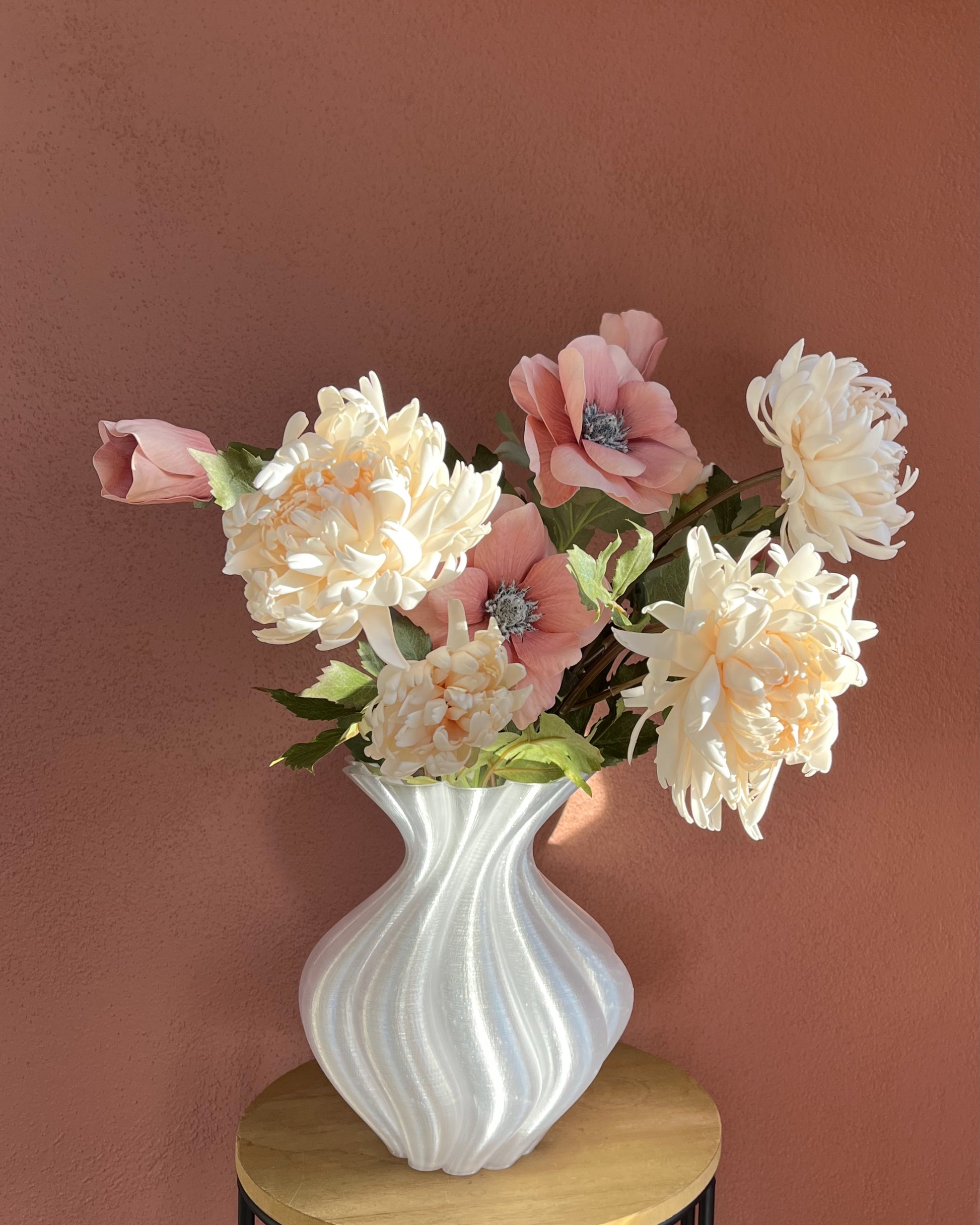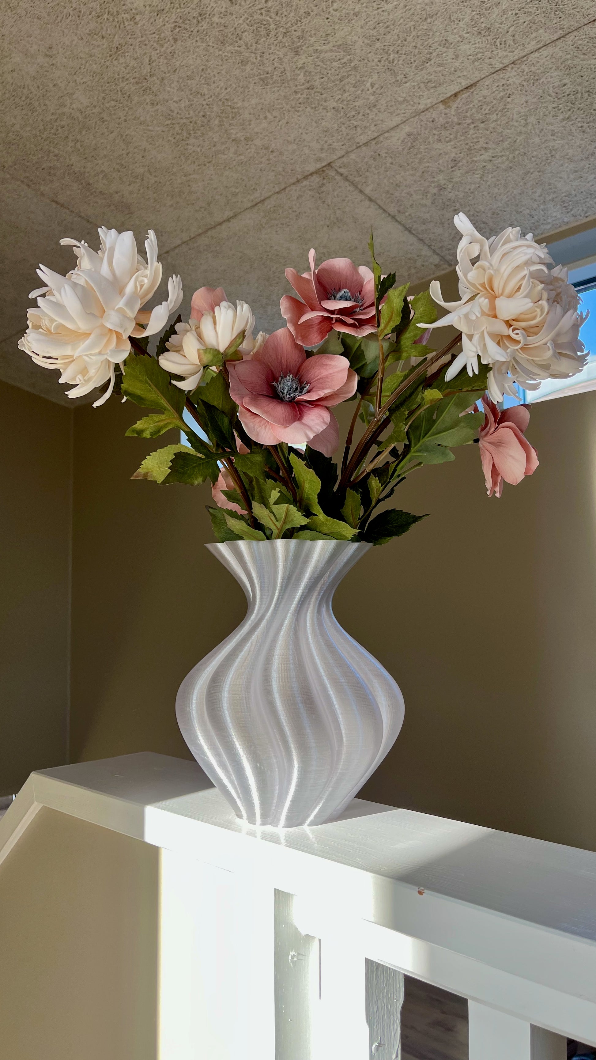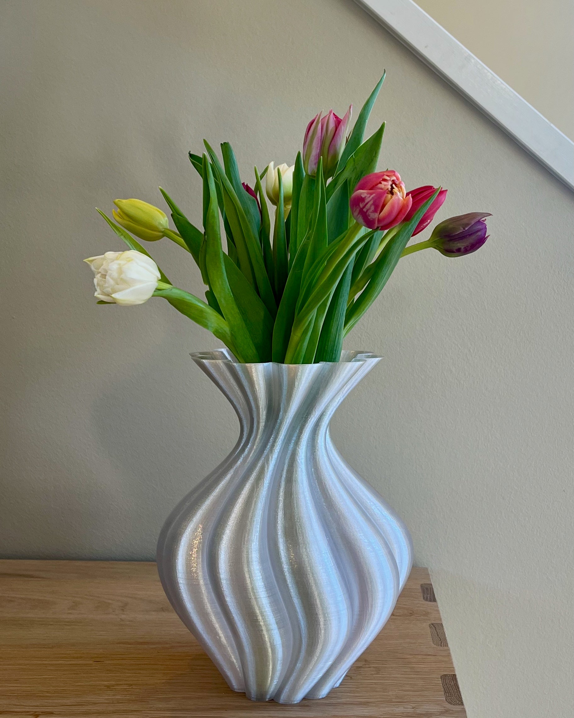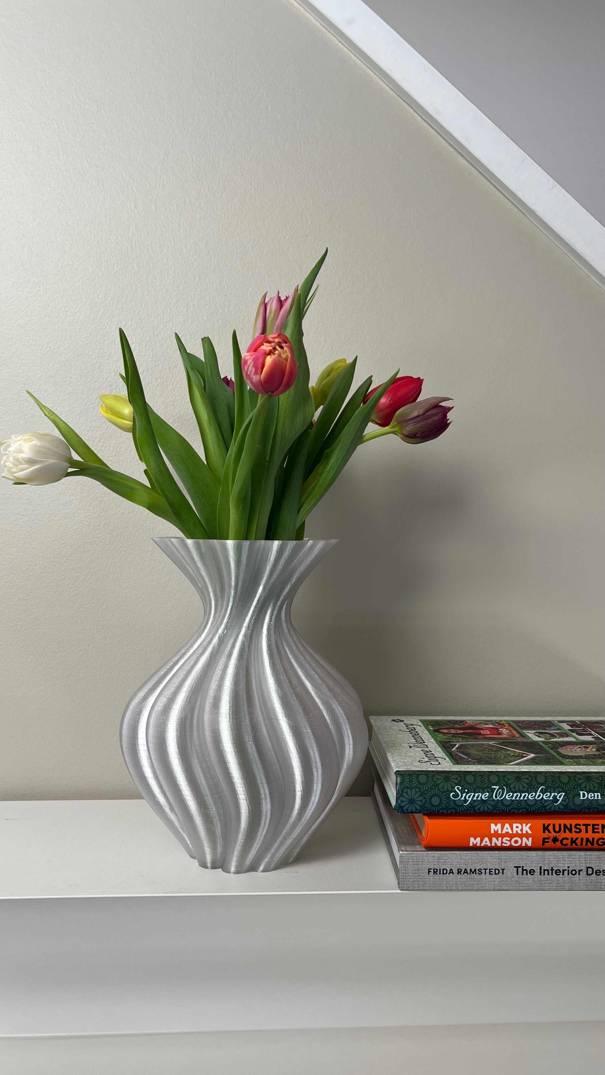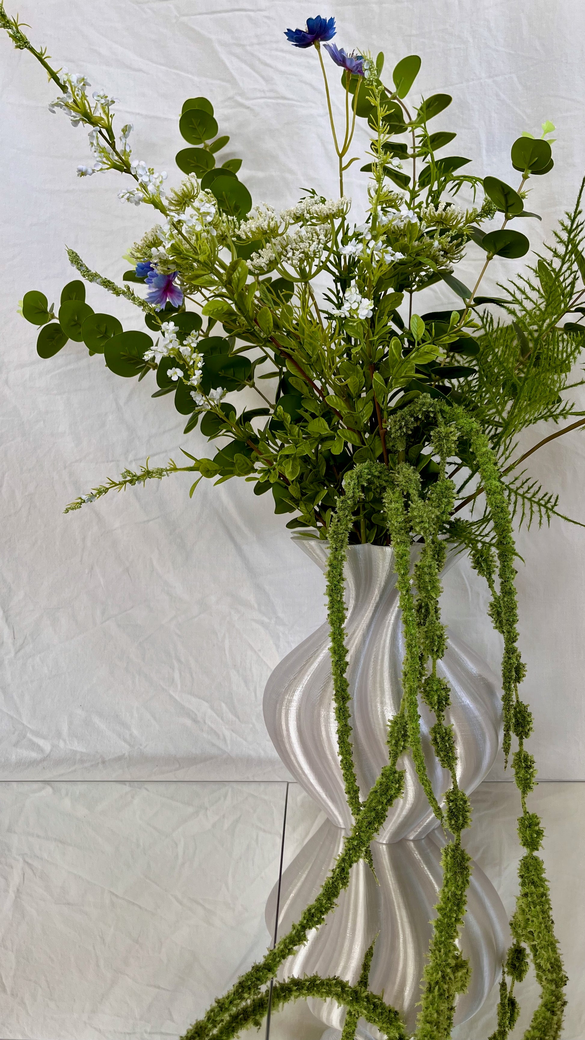Vasen er 3D-printet i PETG-plast, hvilket gør den både robust og stabil, så den står sikkert, uanset hvor du placerer den. Med en højde på 22 cm er Estella perfekt til både friske og kunstige blomster eller tørrede buketter. Materialet giver en let skinnende overflade, der elegant reflekterer lyset og fremhæver vasens unikke struktur.