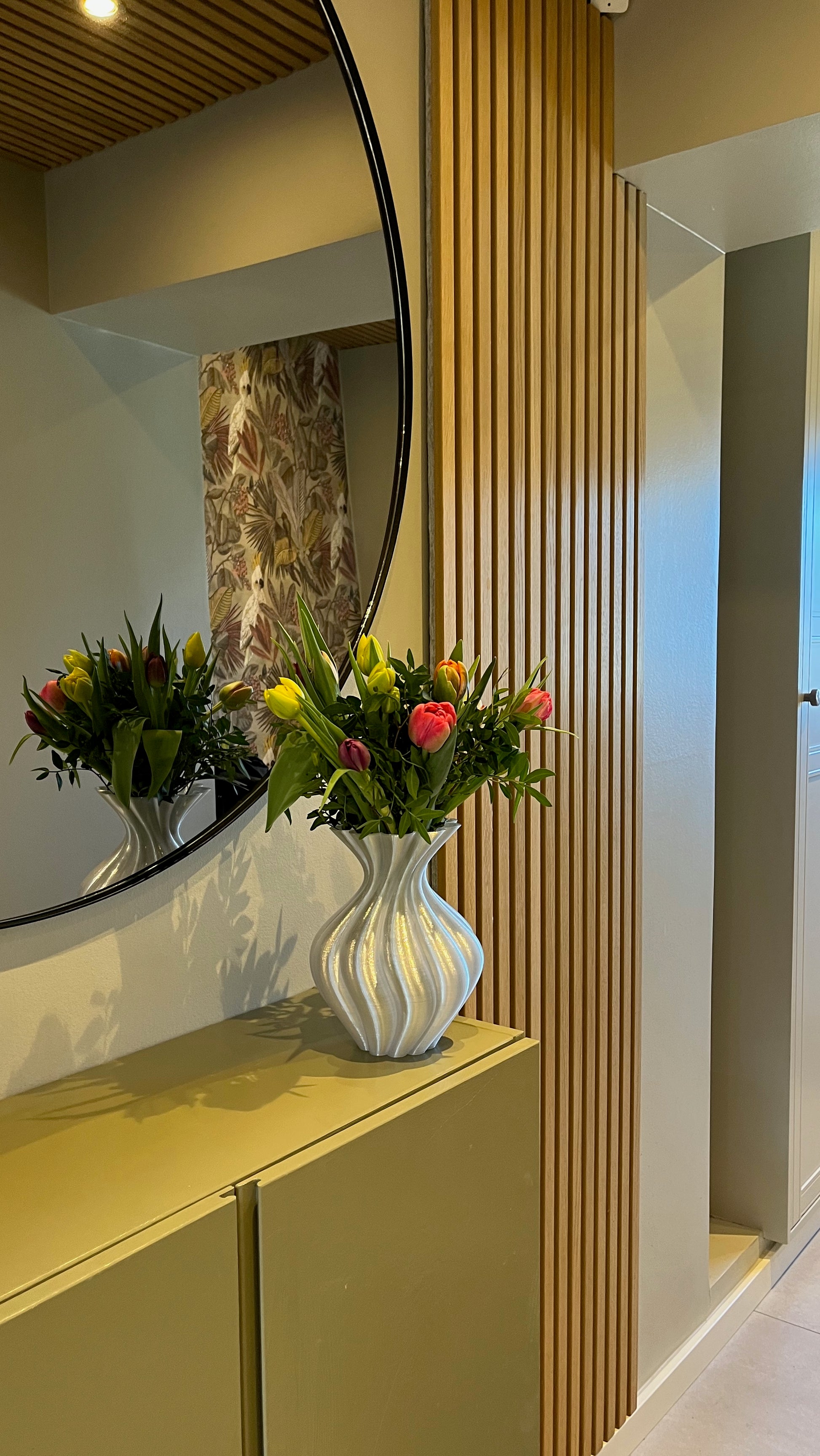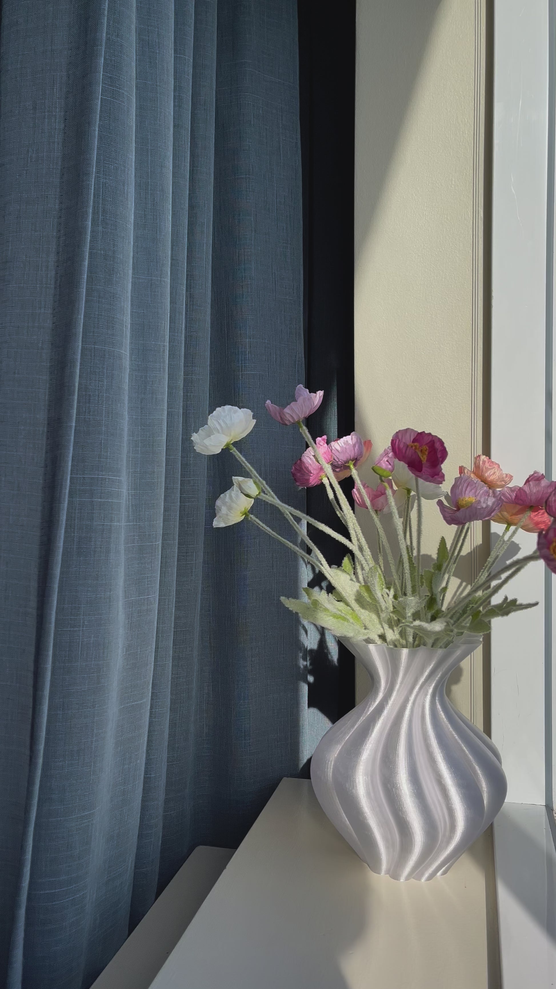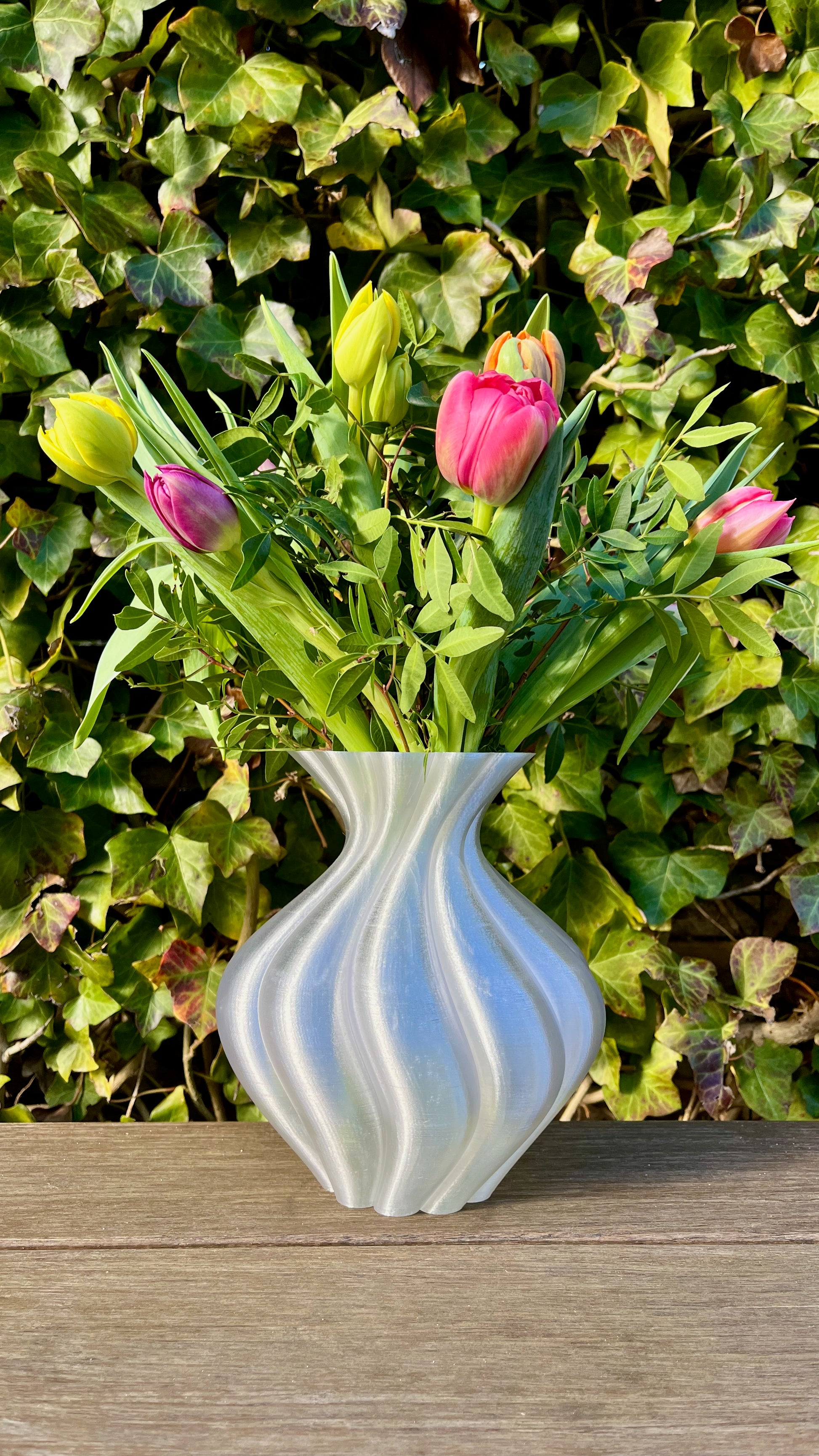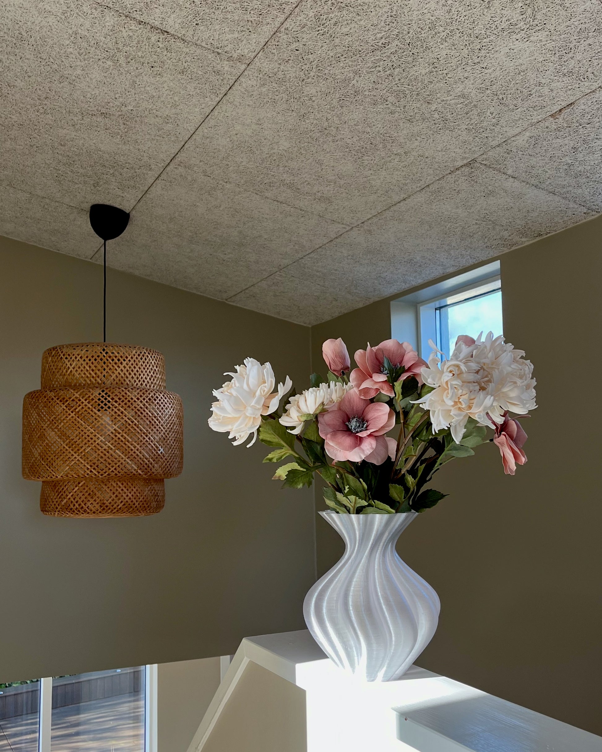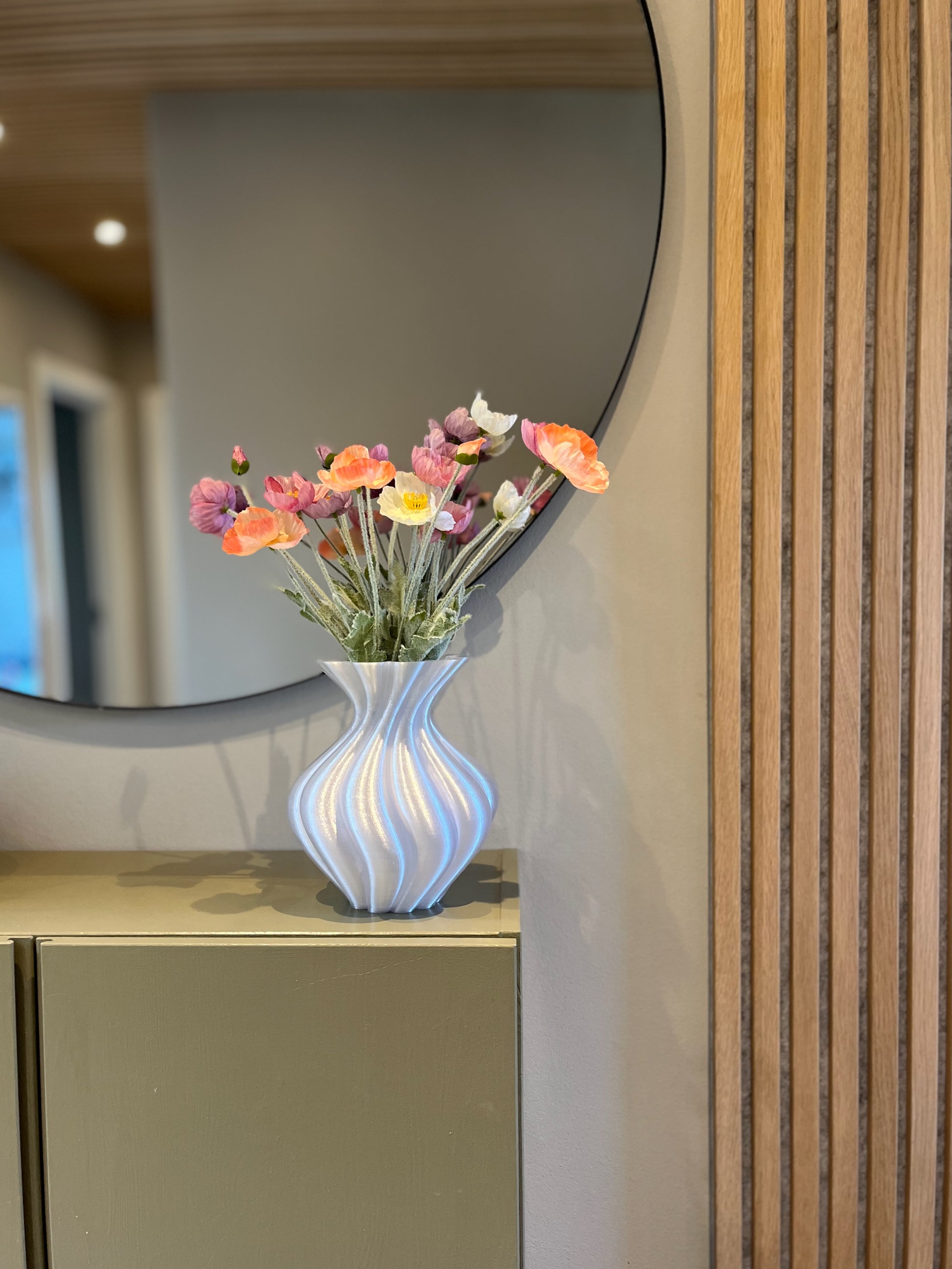 Vasen er 3D-printet i PETG-plast, hvilket gør den både robust og stabil, så den står sikkert, uanset hvor du placerer den. Med en højde på 22 cm er Estella perfekt til både friske og kunstige blomster eller tørrede buketter. Materialet giver en let skinnende overflade, der elegant reflekterer lyset og fremhæver vasens unikke struktur.