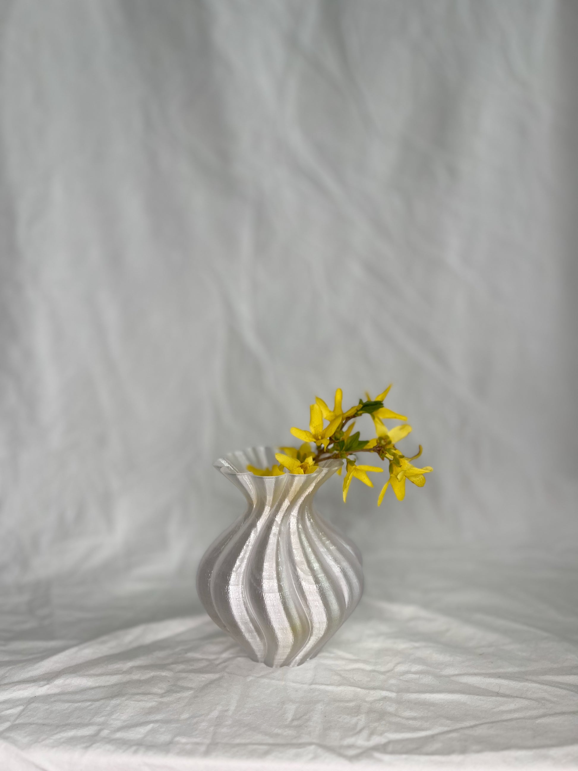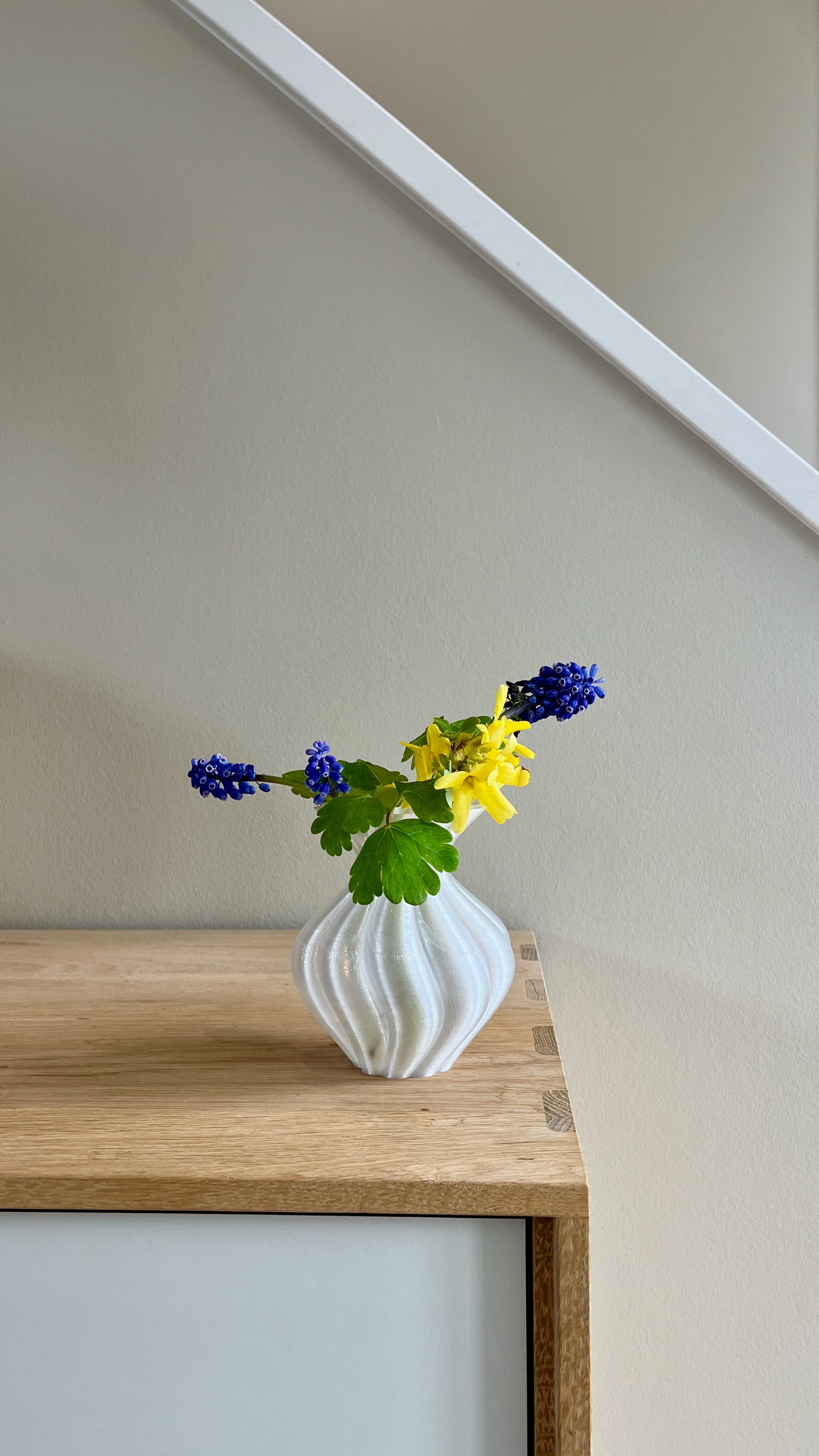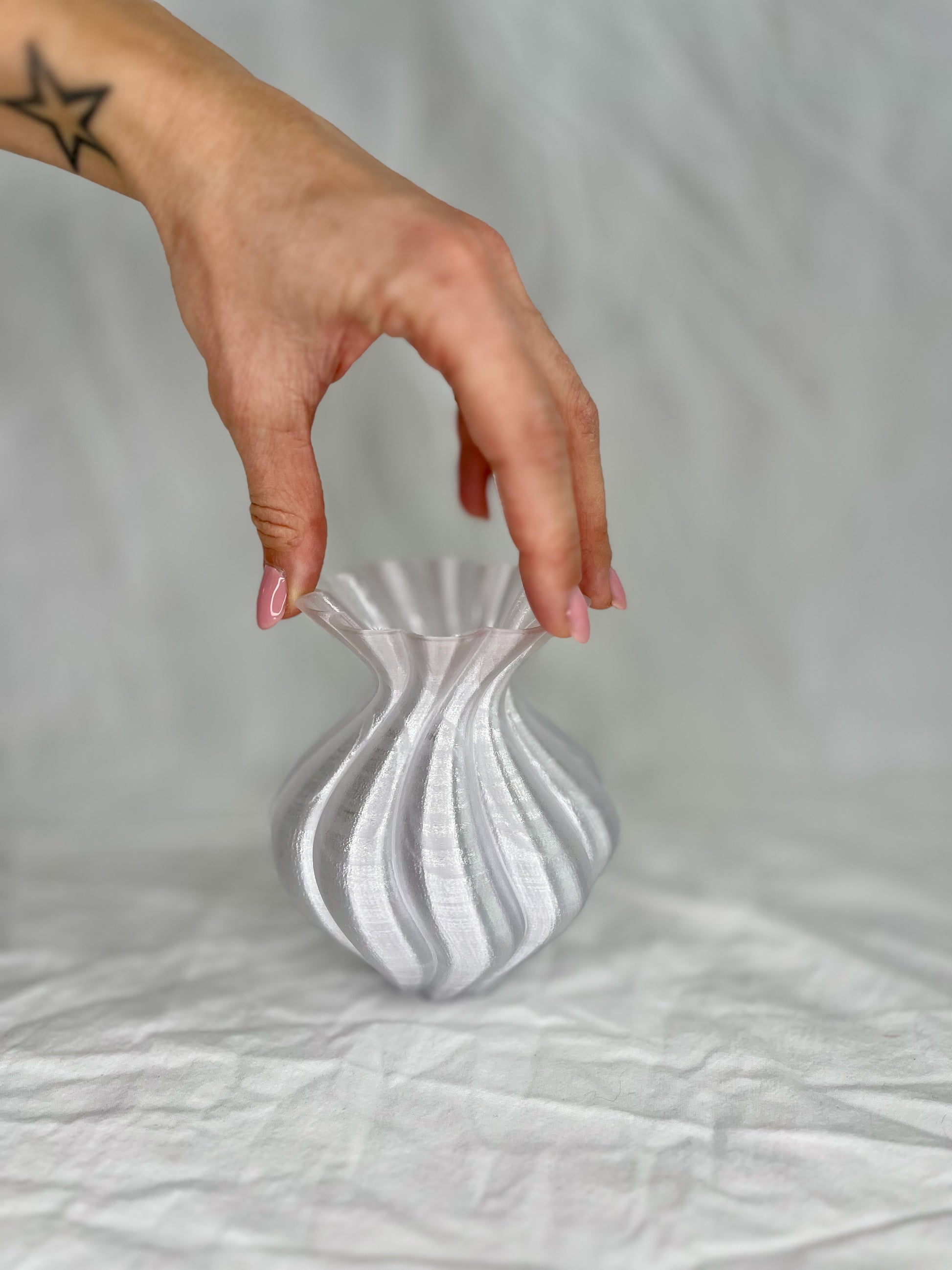 Designet af LulubaDullu og 3D-printet i holdbart PETG i vores eget værksted. Estella Mini passer smukt ind i stilleben, på små hylder eller som makker til den større Estella-vase.